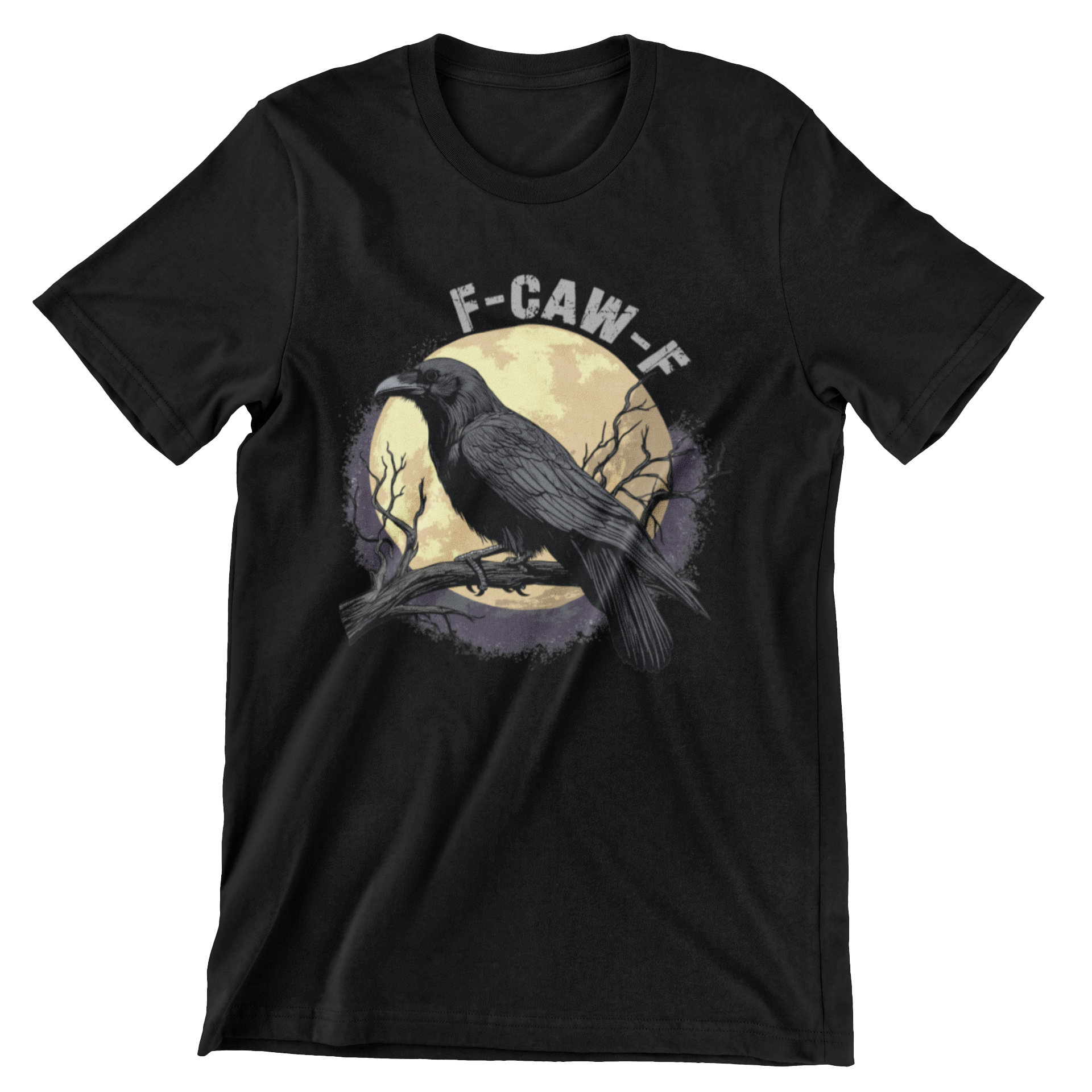 Striking F-CAW-F gothic crow t-shirt featuring a detailed black raven on bare branches against a golden full moon. Perfect for gothic style lovers, dark humor fans, and bird enthusiasts. Great gift for Halloween or everyday edgy wear.